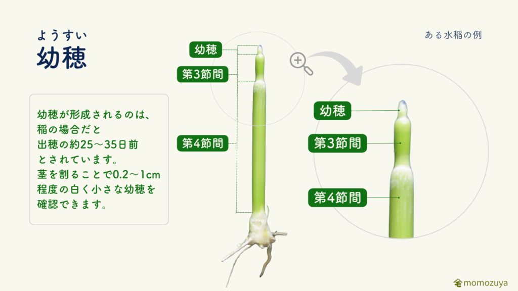 作物の成長初期に現れる非常に重要な段階であり、水稲の場合、稲の茎の内部で形成されはじめた穂の生育初期の一時期のことを指します。