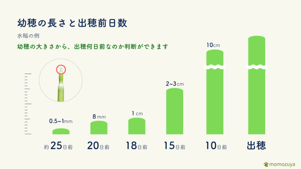 この時期にはまだ穂そのものは見えませんが、将来の実をつくる準備が進んでいます。この時期の管理が収量や品質を大きく左右します。適度な水管理と肥料設計が、幼穂の健全な生育に大きな影響を与えます。